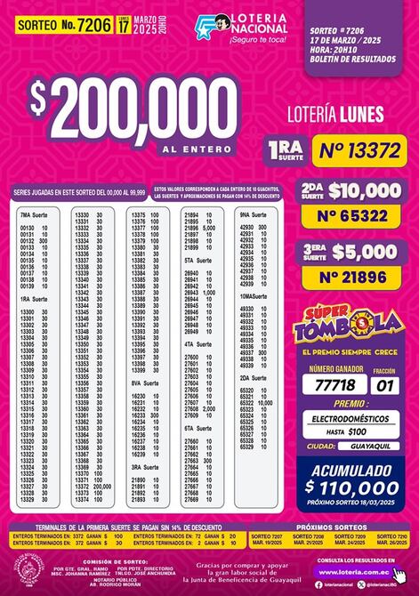 Estos son los resultados del sorteo 7206 de la Lotería Nacional, que jugó la noche del 17 de marzo de 2025.