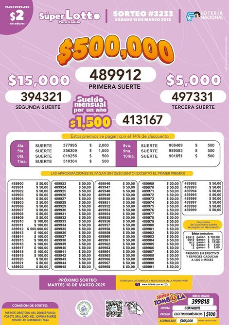 Estos son los resultados del sorteo 3233 del Lotto, de la Lotería Nacional, que se realizó el 15 de marzo de 2025.