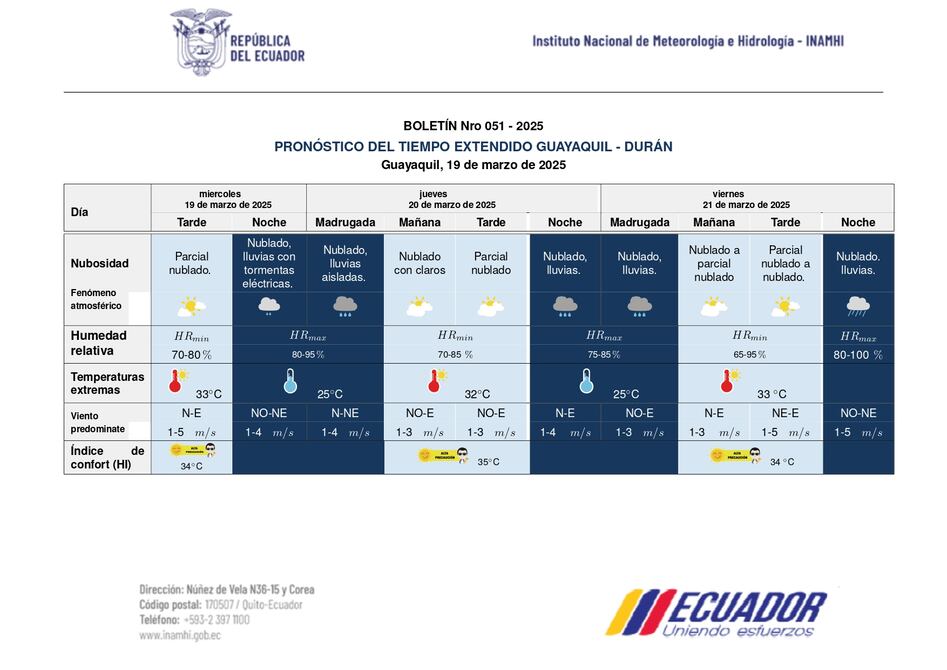 El Instituto Nacional de Meteorología e Hidrología (Inamhi) ha emitido el pronóstico del tiempo para Guayaquil y Durán en los días comprendidos entre el 19 y el 21 de marzo, advirtiendo sobre jornadas con lluvias y tormentas eléctricas intermitentes.
